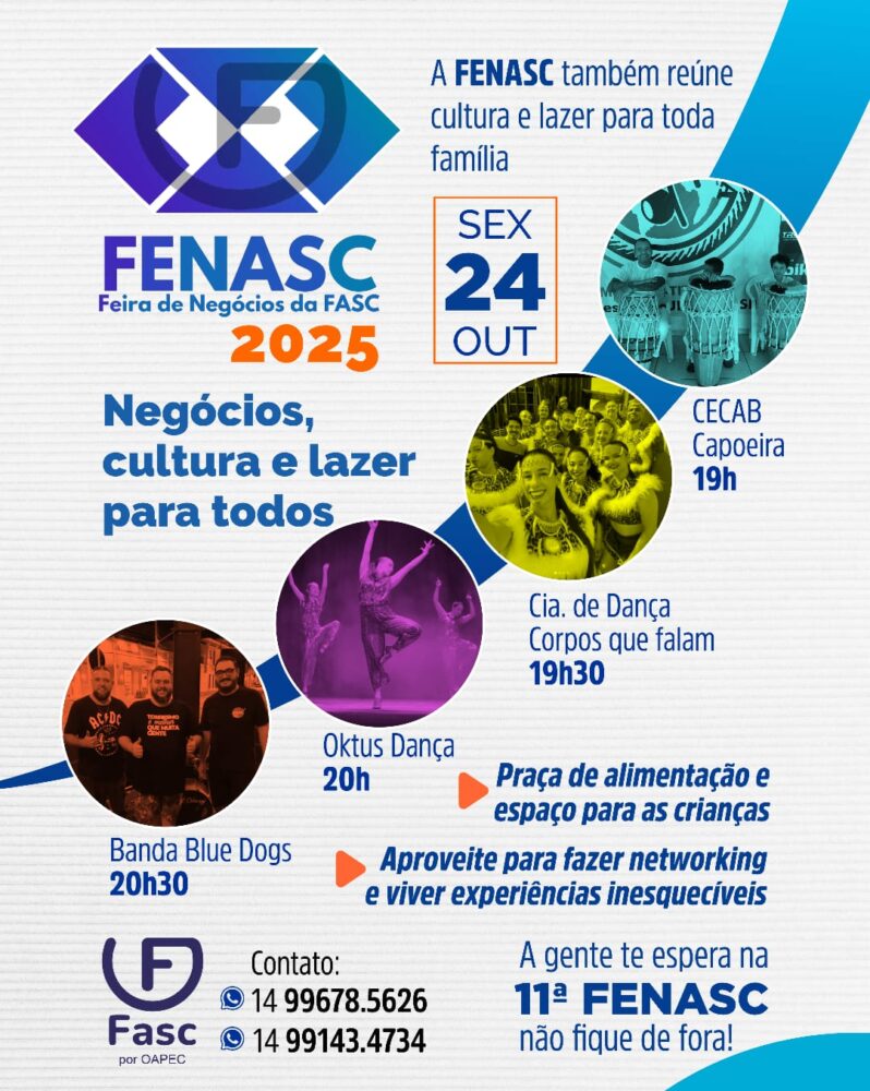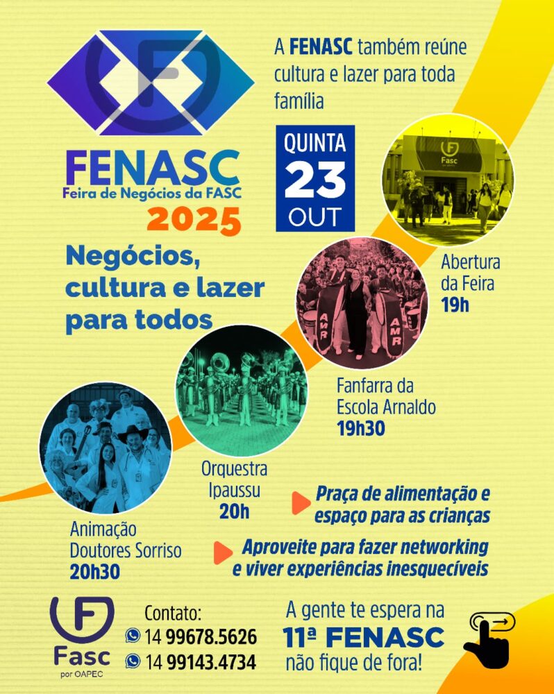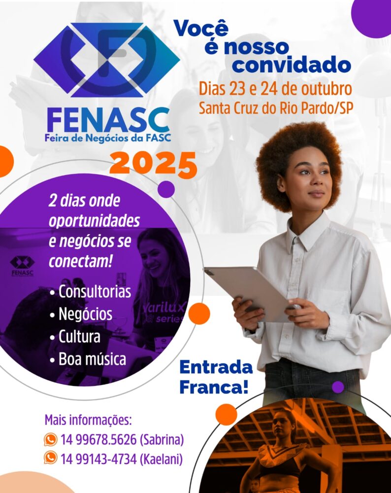 A FASC (Faculdade de Santa Cruz do Rio Pardo) promove nos dias 23 e 24 de outubro a 11ª Feira de Negócios, nas dependências da entidade, localizada na avenida Coronel Clementino Gonçalves, 1021. Com entrada gratuita, o evento, além de possibilitar oportunidades de negócios e networking, também oferece ampla programação cultural, com apresentação de música e dança e ainda praça de alimentação. Mais informações podem ser obtidas pelos (14) 99678-5626 ou (14) 99143-4734.