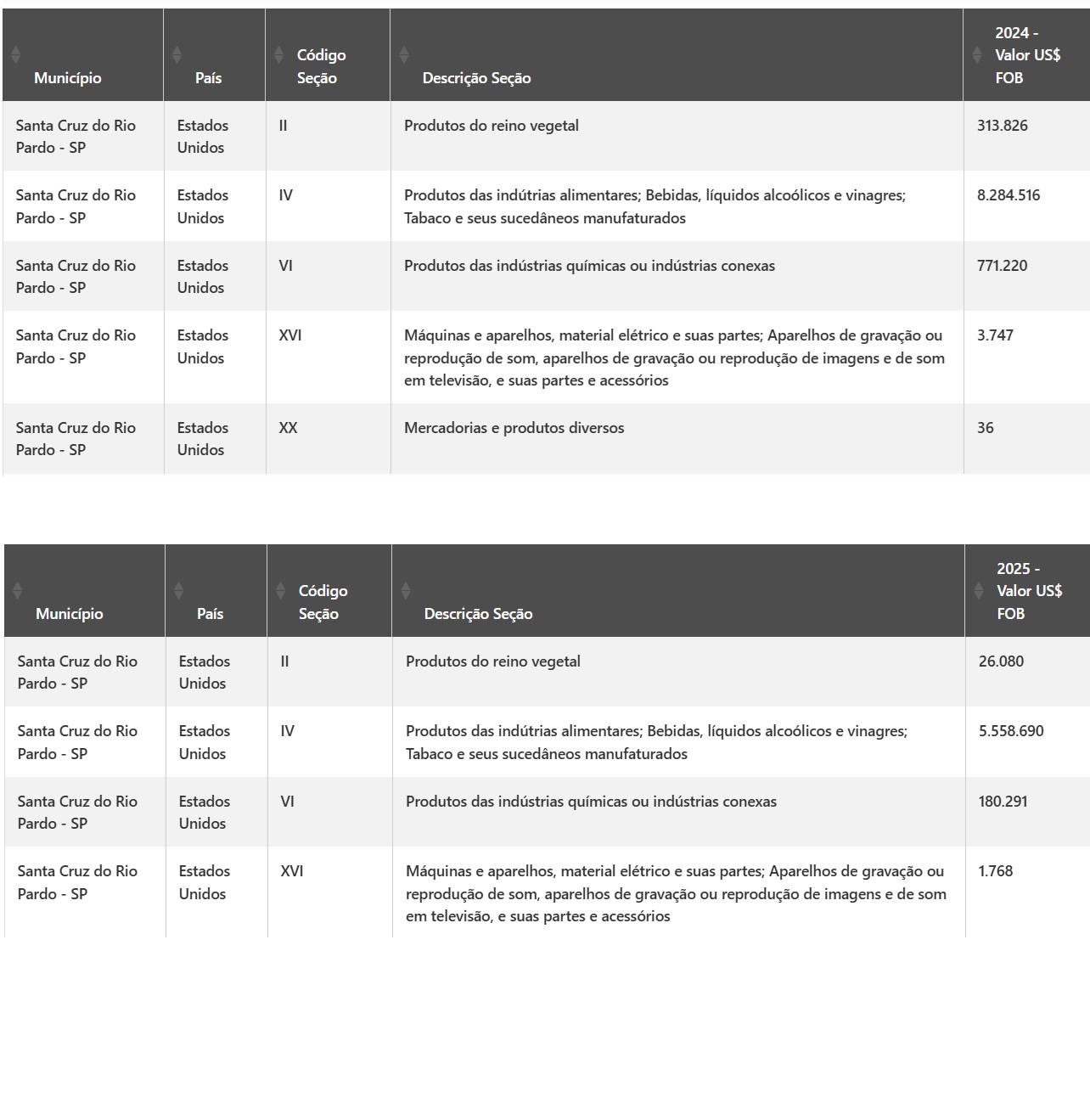 Entre em vigor nesta quarta-feira (06) o tarifaço de 50% sobre a importação de produtos brasileiros pelos Estados Unidos, impactando 906 municípios do país, incluindo Santa Cruz do Rio Pardo que, em 2024, exportou para os americanos US$ 9,4 milhões ou, cerca de R$ 51,7 milhões. Com exceção do suco de laranja, que está entre os produtos que ficaram isentos da tarifa, o parque industrial de Santa Cruz, responsável por enviar aos EUA máquinas e aparelhos, produtos da indústria química e alimentos, foi diretamente atingido pela medida. Mercadorias que embarcarem a partir desta quarta deverão ter a tarifa aplicada, segundo o decreto da Casa Branca. Veja abaixo os principais produtos santa-cruzenses exportados aos EUA em 2024 e até junho do atual ano. Os dados são do Ministério do Desenvolvimento, Indústria e Comércio.