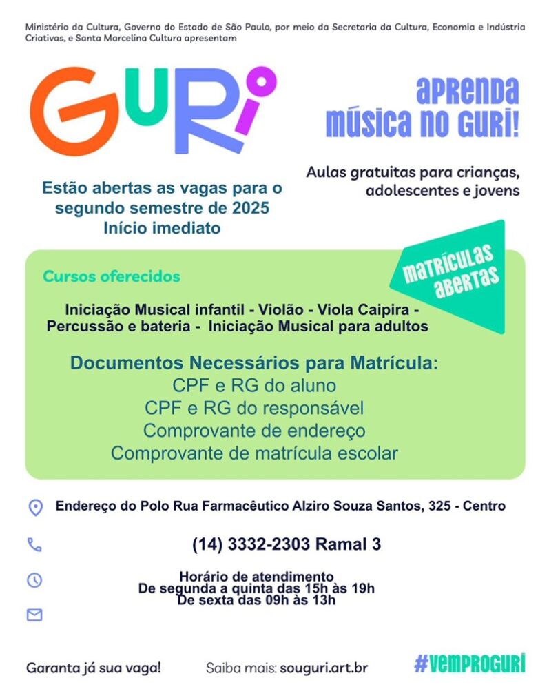 Estão abertas as matrículas para o segundo semestre de cursos de iniciação musical e aulas de instrumentos do Projeto Guri de Santa Cruz do Rio Pardo. Para participar, não é necessário ter conhecimento, nem instrumento. As inscrições podem ser feitas diretamente no polo do projeto, na rua Farmacêutico Alzira Souza Santos 325, de segunda a quinta, das e às sextas-feiras, das 9h às 13. O telefone para mais informações é o (14) 3332-2303 – ramal 3.