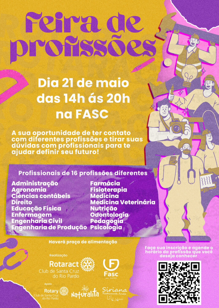 Na próxima terça-feira, 21, a FASC abrirá suas portas para receber a Feira de Profissões do Rotaract. O evento, organizado pelo Rotaract Clube de Santa Cruz do Rio Pardo em colaboração com a FASC, promete ser uma oportunidade única para os jovens explorarem e se inspirarem no mundo das carreiras profissionais.