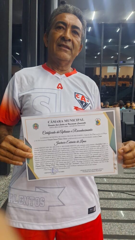 Na noite de segunda-feira (08), a Câmara de Santa Cruz do Rio Pardo homenageou com Moção de Aplauso e Reconhecimento, Juvêncio Estevão de Lima, figura histórica da Escolinha CAS e um dos nomes mais lembrados quando o assunto é trabalho voluntário e compromisso com o esporte de base.