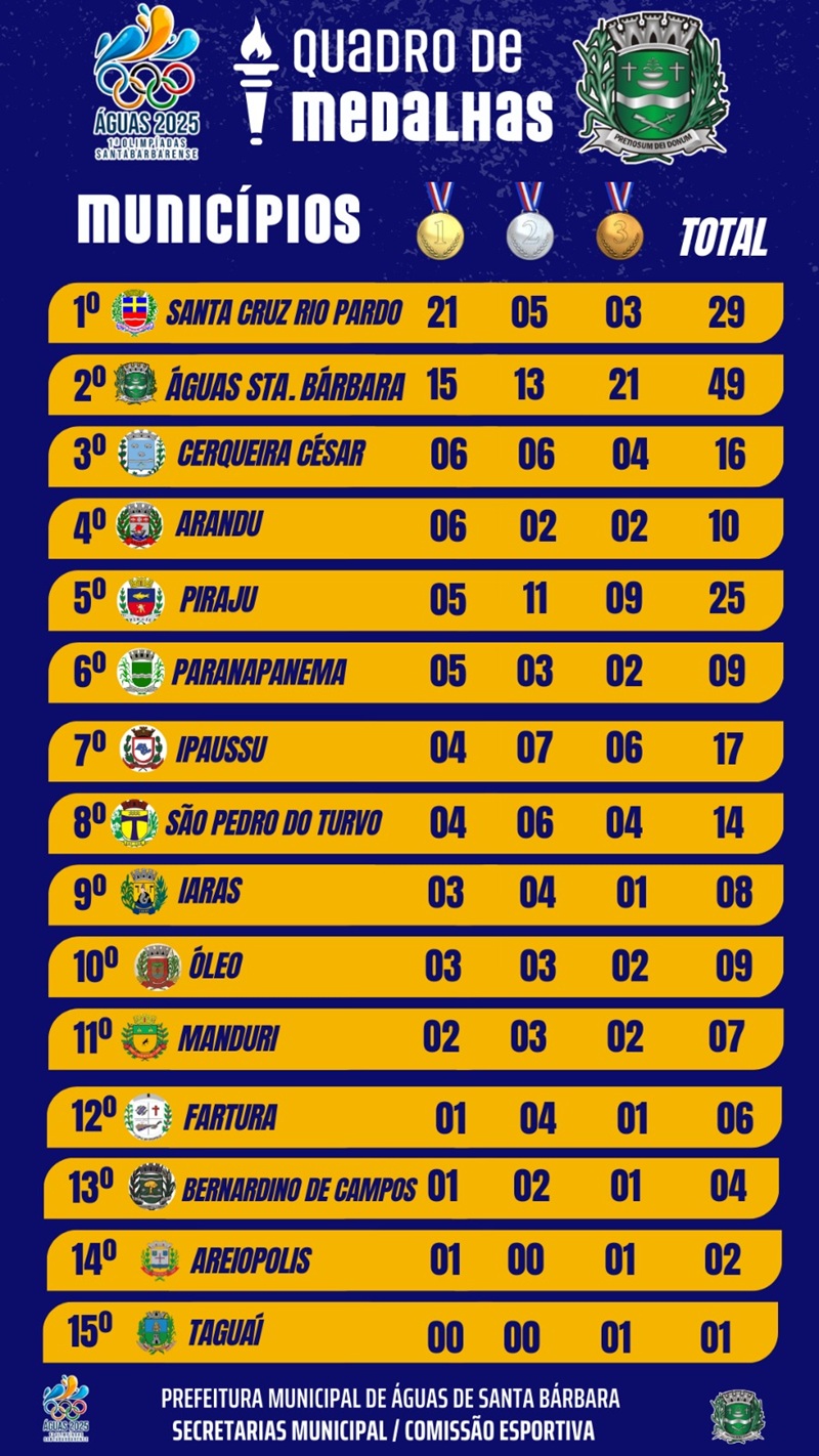 Delegação esportiva de Santa cruz do Rio Pardo foi campeã da 1ª Olimpíada de Águas de Santa Bárbara, que reuniu 17 municípios da região em diversas competições realizadas entre os meses de agosto e setembro. Veja o quadro de medalhas abaixo: