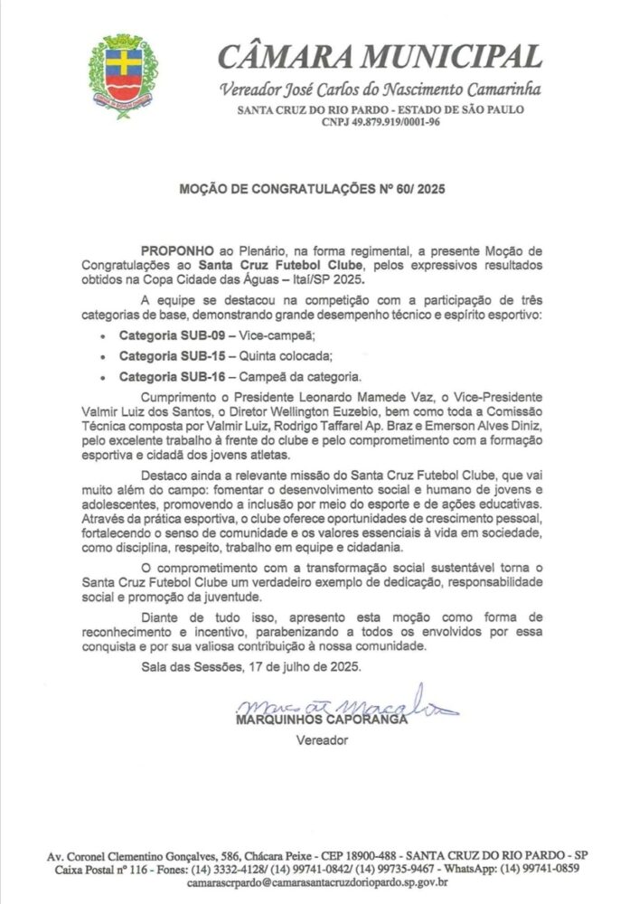 O Santa Cruz Futebol Clube, mais nova escola de futebol da cidade, foi homenageado na Câmara Municipal na sessão de segunda-feira (21). O autor da homenagem foi o vereador Marquinhos de Caporanga. A equipe se destacou na Copa Cidade das Águas, disputada este ano em Itaí (SP) em três categorias, obtendo o vice-campeonato com a Sub-09, o quinto lugar com o sub-15 e sagrando-se campeã com a equipe sub-16. A escola funciona no campo do Parque das Nações. Atualmente são 80 alunos de 8 a 16 anos, com aulas gratuitas.
