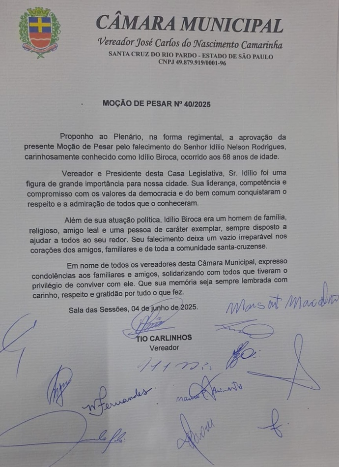 Moção de Pesar pelo falecimento de Idílio Nelson Rodrigues, o Idílio Biroca, falecido no final do mês de maio, aos 68 anos, foi aprovada por unanimidade na sessão da Câmara de segunda-feira (09). O autor da proposta, o vereador Tio Crlinhos, entregou a homenagem a Bianca Rodrigues, filha de Idílio, que foi vereador e presidente da Câmara de Santa Cruz.