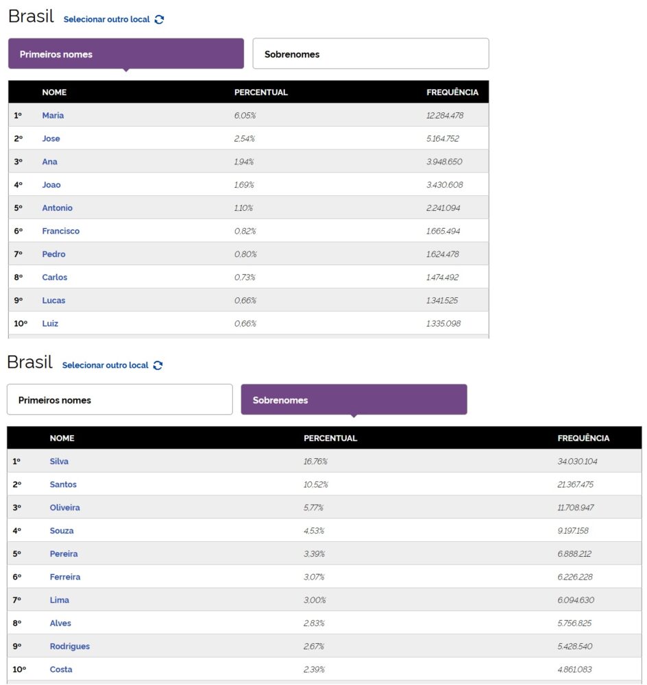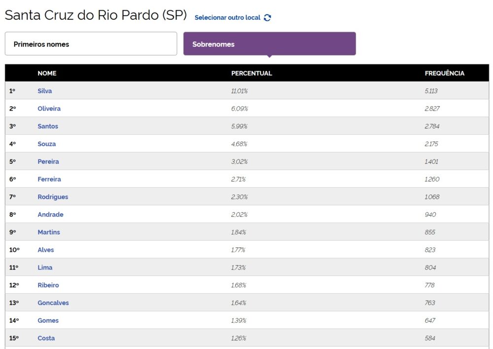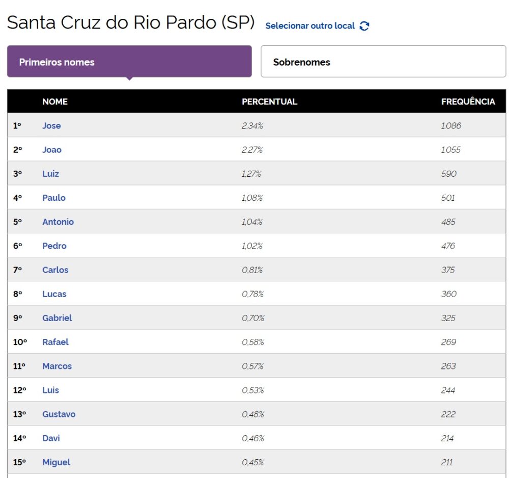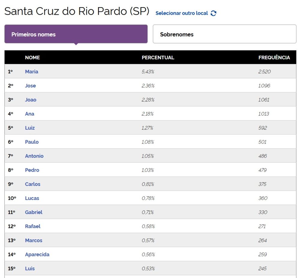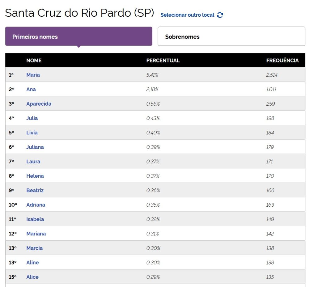 Maria, José, João, Ana e Luiz são os nomes mais populares em Santa Cruz do Rio Pardo, segundo dados divulgados terça-feira (04) pelo IBGE, levando em consideração as estatísticas do Censo demográfico de 2022. O levantamento também traz os sobrenomes mais comuns: Silva, Oliveira, Santos, Souza e Pereira, dominam os cinco primeiros lugares do ranking em Santa Cruz. No topo da lista feminina estão Maria, Ana, Aparecida, Julia e Lívia. Entre os homens predominam José, João, Luiz, Paulo e Antonio. Entre os mais raros estão Anelise, Alícia e Anésio, cada um deles nomeando apenas dez pessoas na cidade. (VEJA ABAIXO)