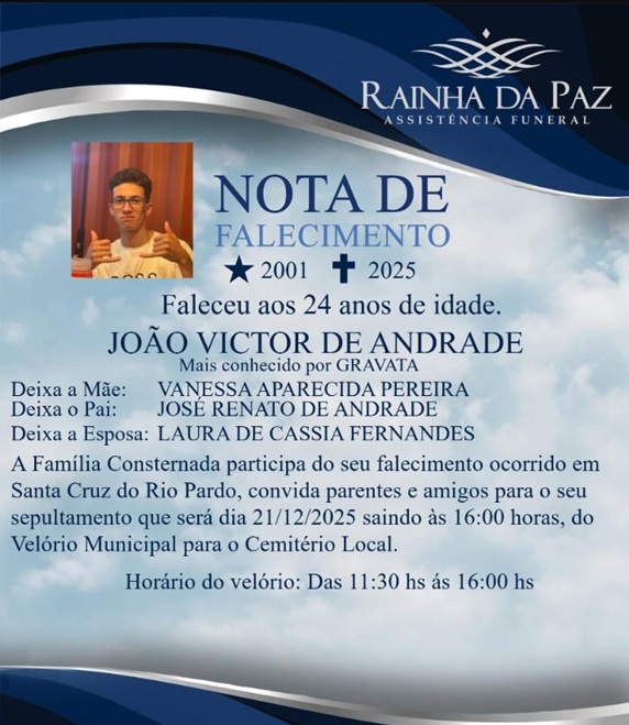 Morreu na manhã deste domingo (21), João Victor de Andrade, de 24 anos, vítima de acidente ocorrido na noite de 16 de dezembro, na SP-225, próximo ao trevo da Guacira, em Santa Cruz. O acidente envolveu duas motocicletas. João Victor, conhecido como “gravata”, conduzia sua moto sentido Chácara Peixe quando após ultrapassar um caminhão, colidiu com outra motocicleta, que trafegava à frente do caminhão. Com o impacto, João Vitor ainda bateu em uma placa de sinalização sofrendo múltiplas fraturas. Ele foi socorrido pelo Samu e levado em estado grave à Santa Casa, onde estava internado desde então. O condutor da outra motocicleta teve ferimentos leves, foi encaminhado à UPA do município e liberado. João Victor deixa a mãe, Vanessa Aparecida Pereira, o pai, José Renato de Andrade, e a esposa, Laura de Cássia Fernandes. O velório será no Velório Municipal, das 11h30 às 16h00, e o sepultamento acontece neste domingo, 21 de dezembro de 2025, às 16h.