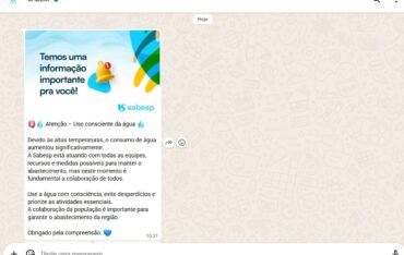 Sabesp utiliza WhatsApp para pedir que a população economize água