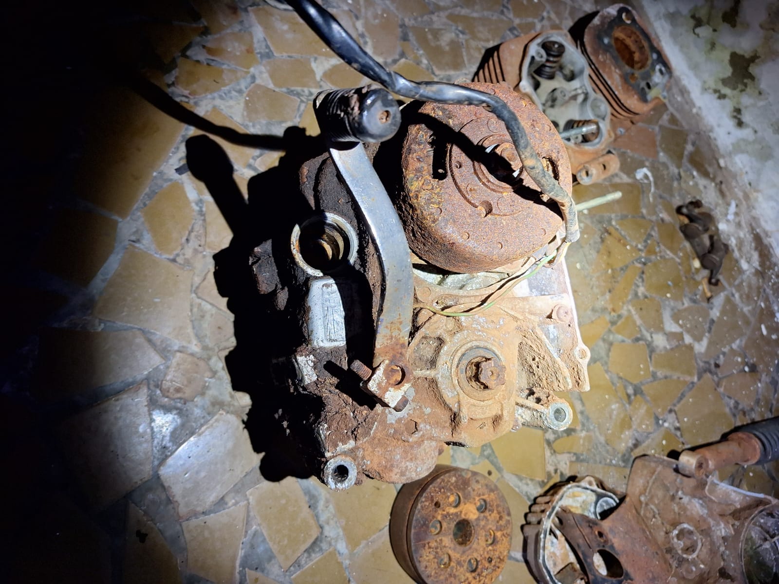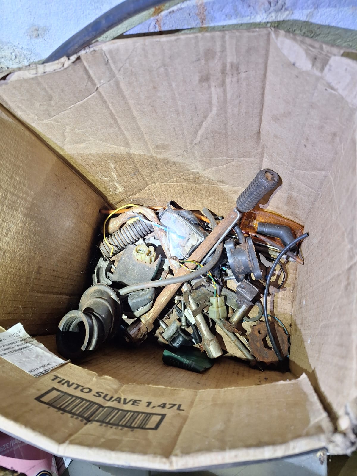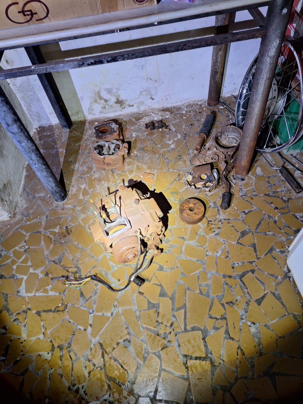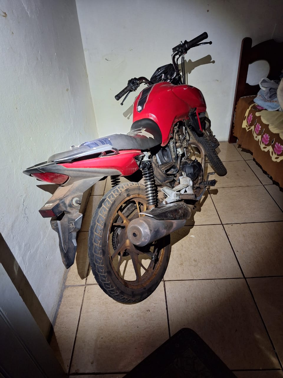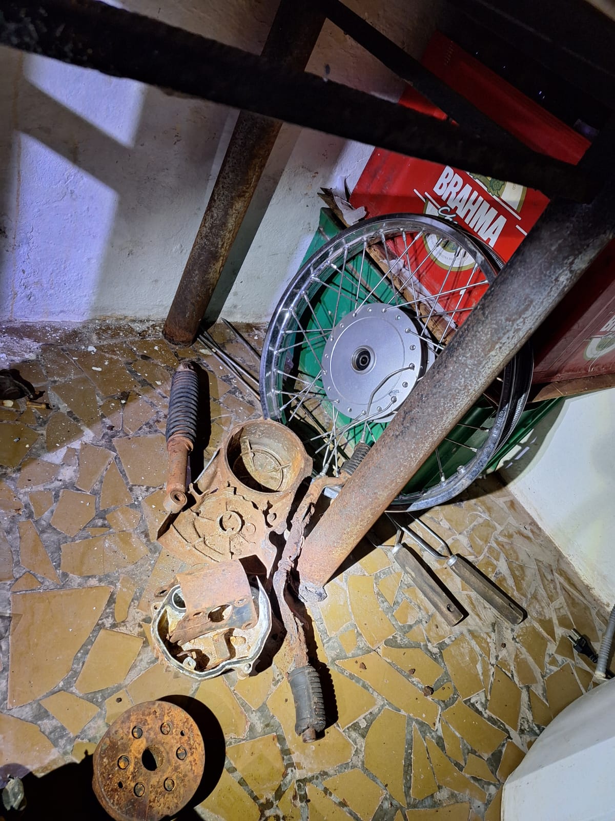 Além disso, durantes as buscas pela residência, a equipe policial também descobriu peças sem procedência ao redor dos cômodos da residência, como motor, quadro de motocicleta, faróis, entre outros.
