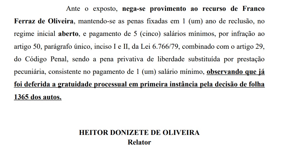 “Segundo foi apurado, o denunciado Aser era possuidor do imóvel rural Chácara do Pinheiro, mas não tinha o título legítimo de propriedade. Em abril de 2015, agindo em concurso com Franco, efetuaram o loteamento da área, passando a vender lotes para fins urbanos. Franco intermediava a venda dos lotes e que tinha conhecimento acerca da falta de regulamentação do loteamento da Chácara do Pinheiro perante à Prefeitura local. Diversos compradores confirmaram que adquiriram os lotes irregulares da Chácara Pinheiro do denunciado Franco, sabendo que atuava em nome do proprietário da área rural, o denunciado Aser. Os adquirentes narraram, ainda, que efetuaram o pagamento do valor de entrada do lote ao denunciado Franco”, diz trecho da decisão.